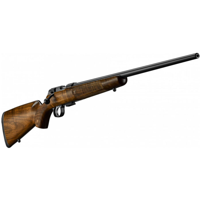 The classic American-style rimfire rifle, this gorgeous 457 has a 24.8” barrel with no sights and is meant to be topped with a scope. Its Turkish walnut stock has a high, flat comb and a classic checkering pattern. Like all of CZ’s 457s, it has an 11mm dovetail milled into the top of its receiver for attaching scope ringmounts.