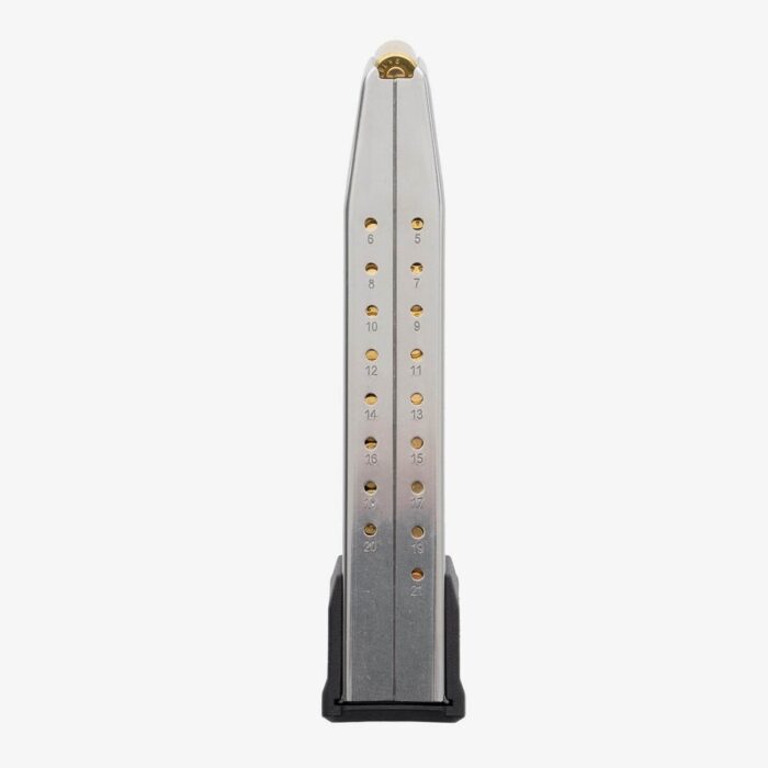 When capacity is king, durability and reliability are required. The AMAG 21 SG9 brings maximum capacity and rugged Magpul standards to the SIG P320/M17 platform, giving you an attractively priced and dependable magazine. The corrosion-resistant stainless-steel construction, long-life stainless spring, and high-visibility anti-tilt follower all combine with flared floorplates to make handling, firing, and maintenance simple, so you can carry more ammo, spend less time swapping mags, and trust your gear when it matters most.