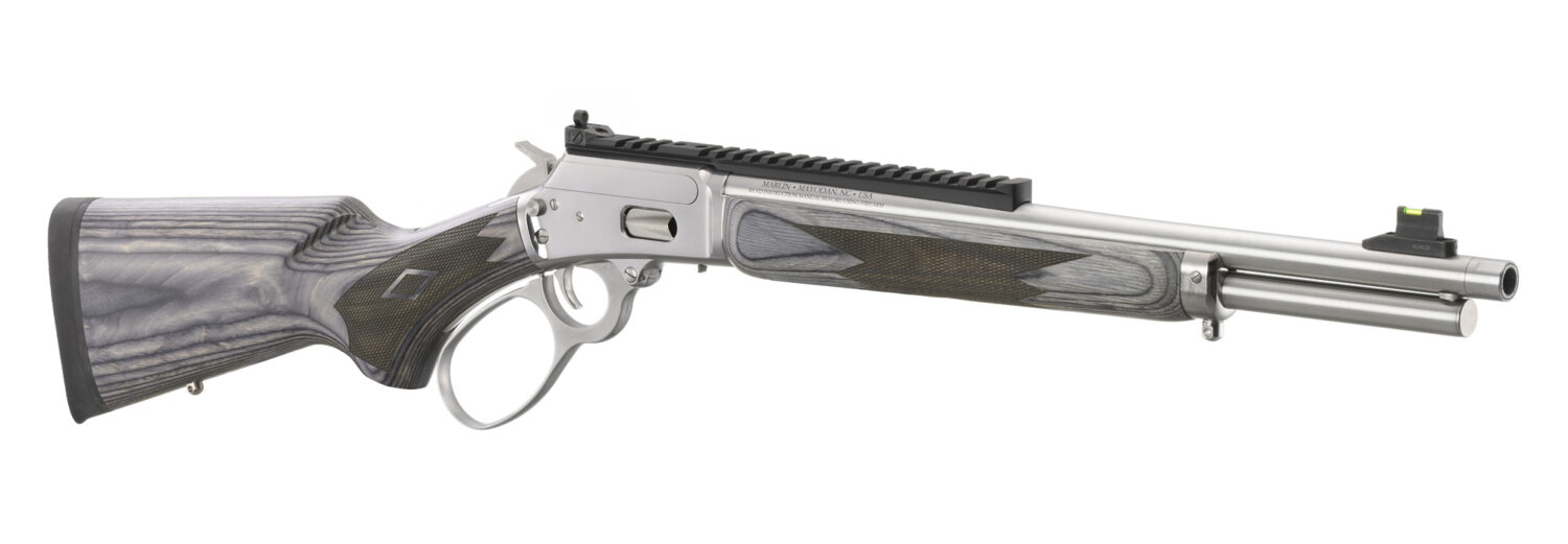 Time-honored styling including a polished stainless finish, gray laminate stock, polished bolt and threaded barrel contribute to this high-quality lever-action rifle.